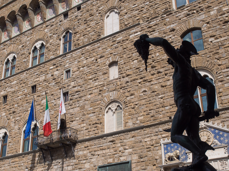 整個領主廣場就是一個露天美術館,旁邊的傭兵涼廊裏面有大量的雕塑。比較有名的有「珀耳修斯」,說的是英雄珀耳修斯把美杜莎收拾掉的故事。若單是因為制作者花了十年時間而成名,未免太過膚淺;若是因為這巨大的青銅像身體是一體成型,也就過於著眼於技術了。這銅像能和大衛像並立於此,我想是因為它們同時抓住了該時代的精神,那就是「自信」,也是文藝復興在佛羅倫斯出現的真正原因。