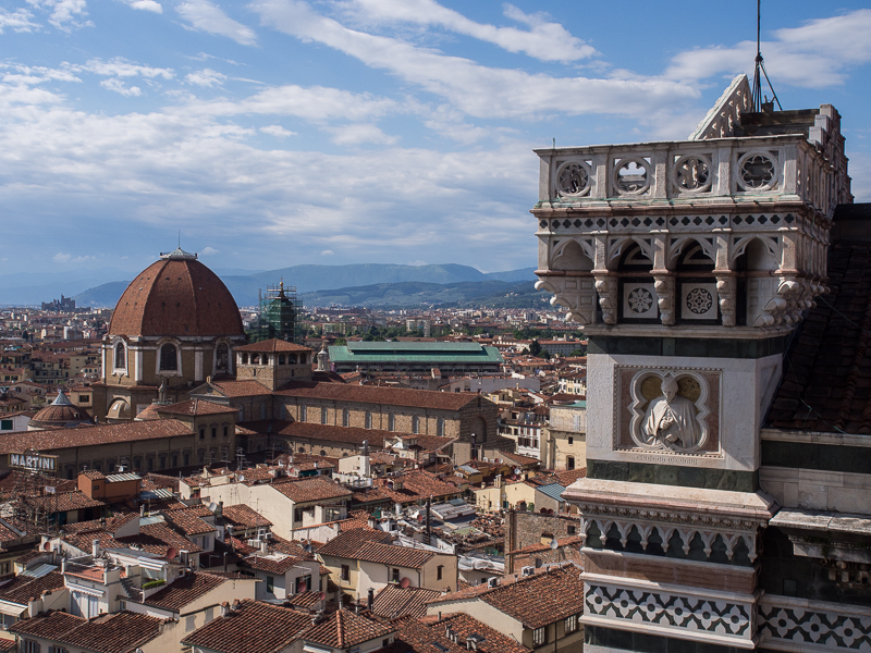 下一個目的地是有名的聖母百花大教堂(Cattedrale di Santa Maria del Fiore,由於教堂會在六點關閉,只有先參觀鐘樓了。買過門票,然後前往排隊。門票在第一次使用後的二十四小時內可繼續使用,憑票可參觀鐘樓、穹頂、主教堂、地下博物館和洗禮堂。換句話說明天也會回來繼續參觀。