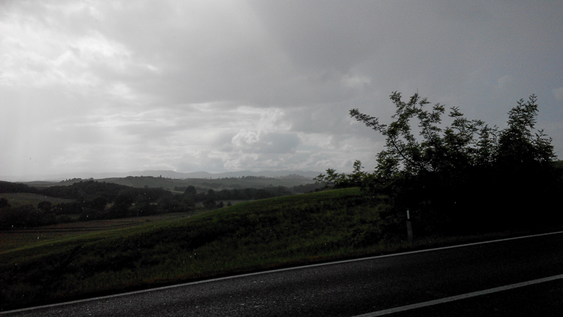 兩一陣陣地下,把雨衣穿上上路。一般騎車的人都不穿雨衣,因為速度都被風阻慢下來。但是在長途騎行時,雨衣超讚的。第一,裏面的衣服不會濕。第二,雨衣把冷風都擋下來,還起了保暖的作用。
