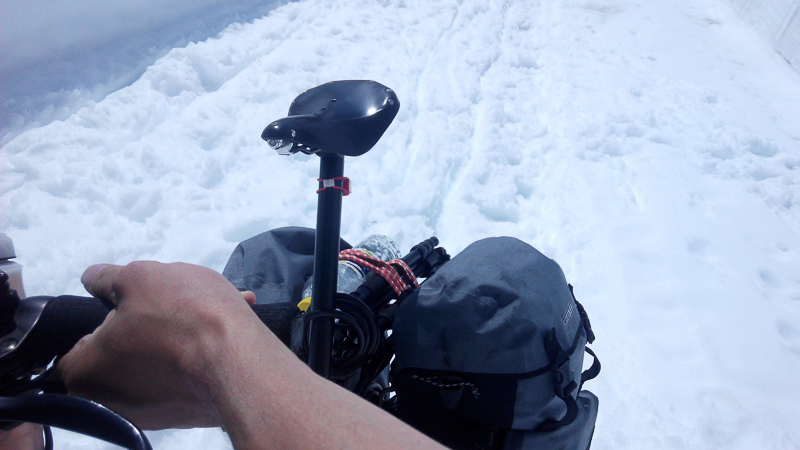 繼續爬升,這樣開始每個太陽照不到的彎位都堆滿了雪,必需用推的。由於行李的關係,整個車輪都陷在雪裏,非常難推。