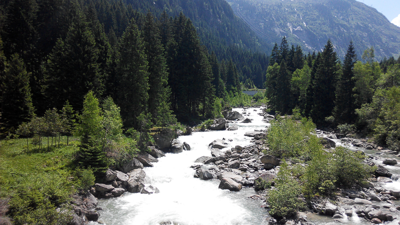 這裏左邊是冰川融化成的河水,右邊是典型的瑞士風光。